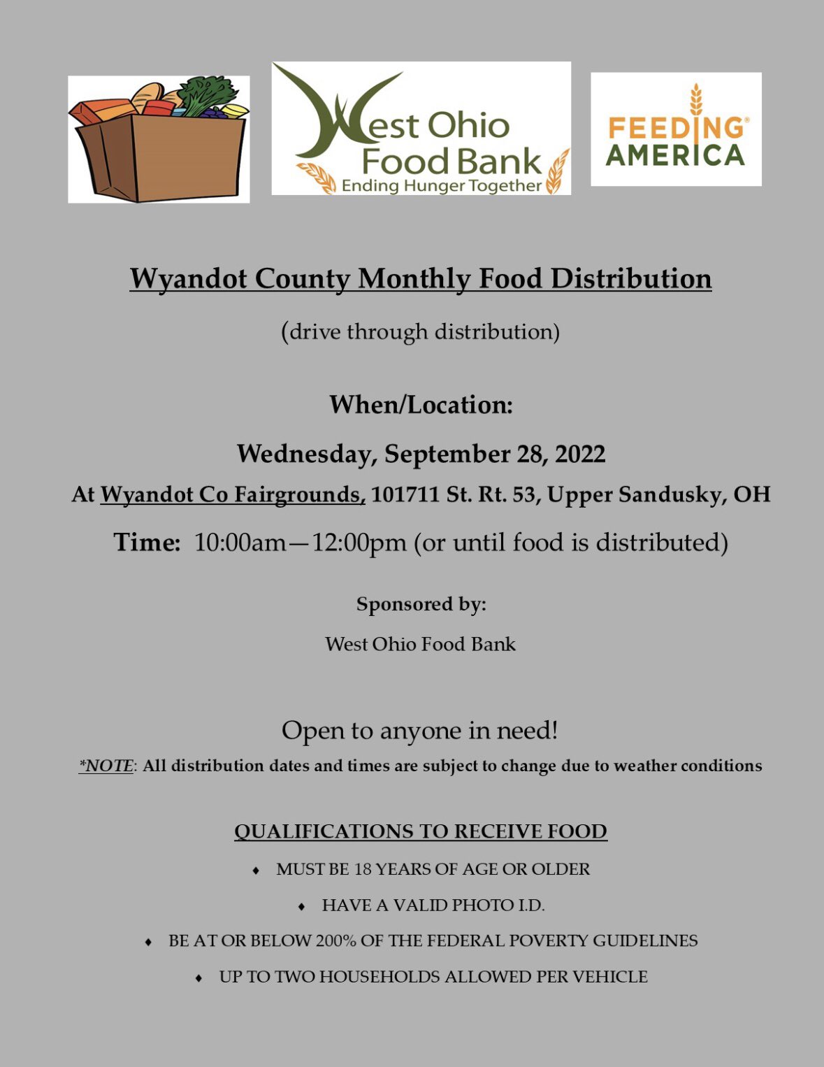 2022 Food Produce Giveaway Locations and Times. Welcome to the West Ohio Food Bank. Call Us For Information 419 222-7946.
